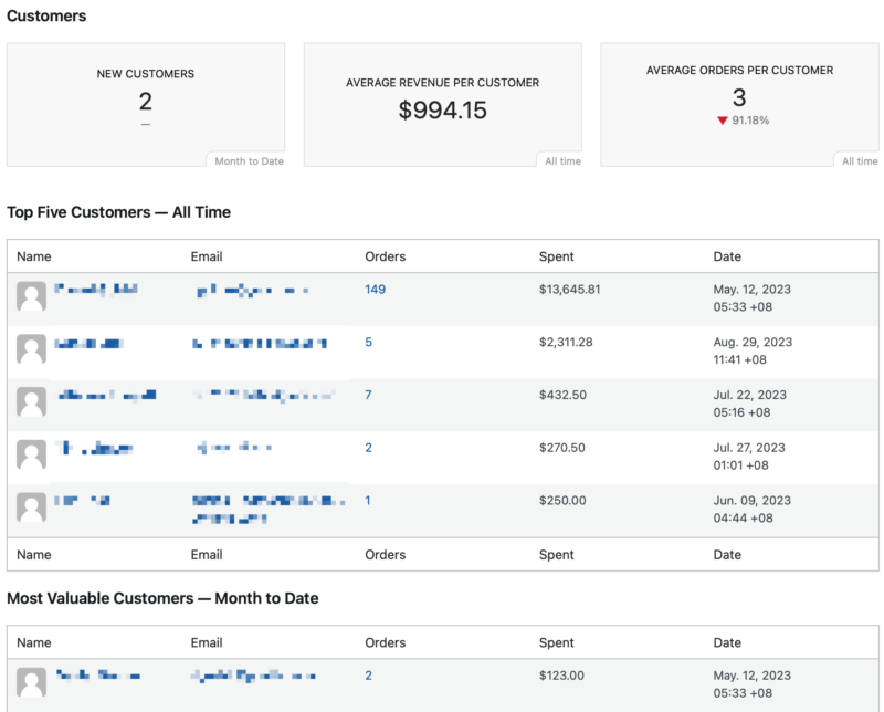 - Product Sales: Download a CSV file containing a record of each sale of a product along with the customer information.