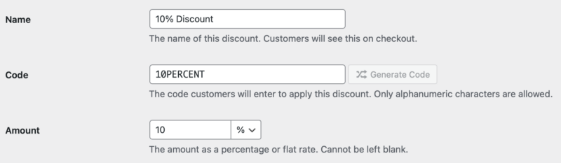 To create a discount code, at minimum, it requires a Name, Code, and an Amount.