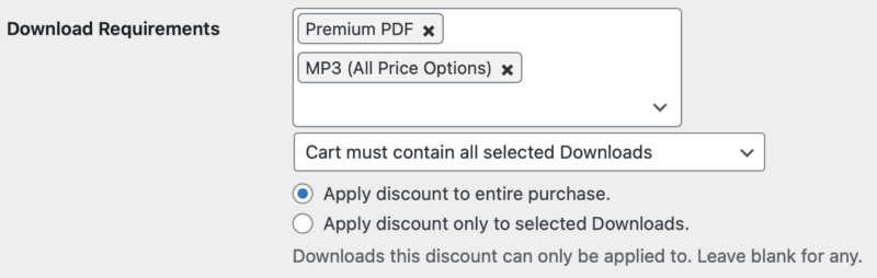 - Specify if the discount applies to the entire purchase or only the downloads selected for this discount.
