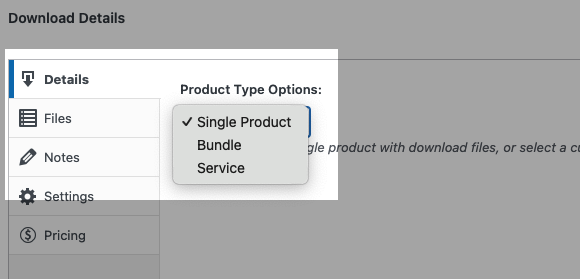 Bundle: Allows you to combine more than one Product into a single package and price. This replaces the Download Files section with a Product / Download selection.