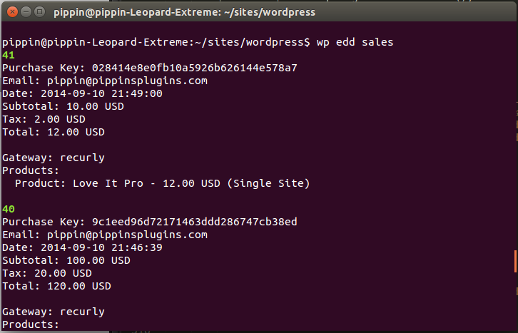 The wp edd sales command will output a list of your recent store sales. Each sale record will include the payment ID, the total, the customer email, the date, the tax, any fees, the payment gateway used, and a list of products included in the purchase: