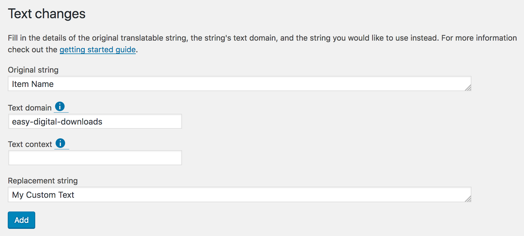• Text domain – This field requires a unique identifier that each plugin or theme must have. For Easy Digital Downloads, the text domain is easy-digital-downloads. If you need assistance finding the text domain for another plugin or theme, please contact the developer.