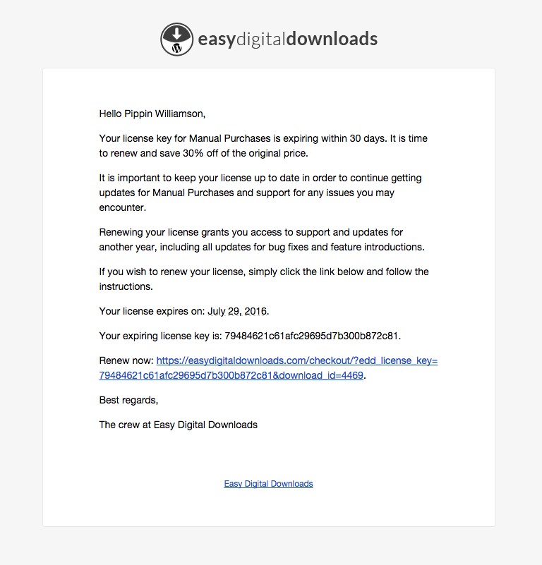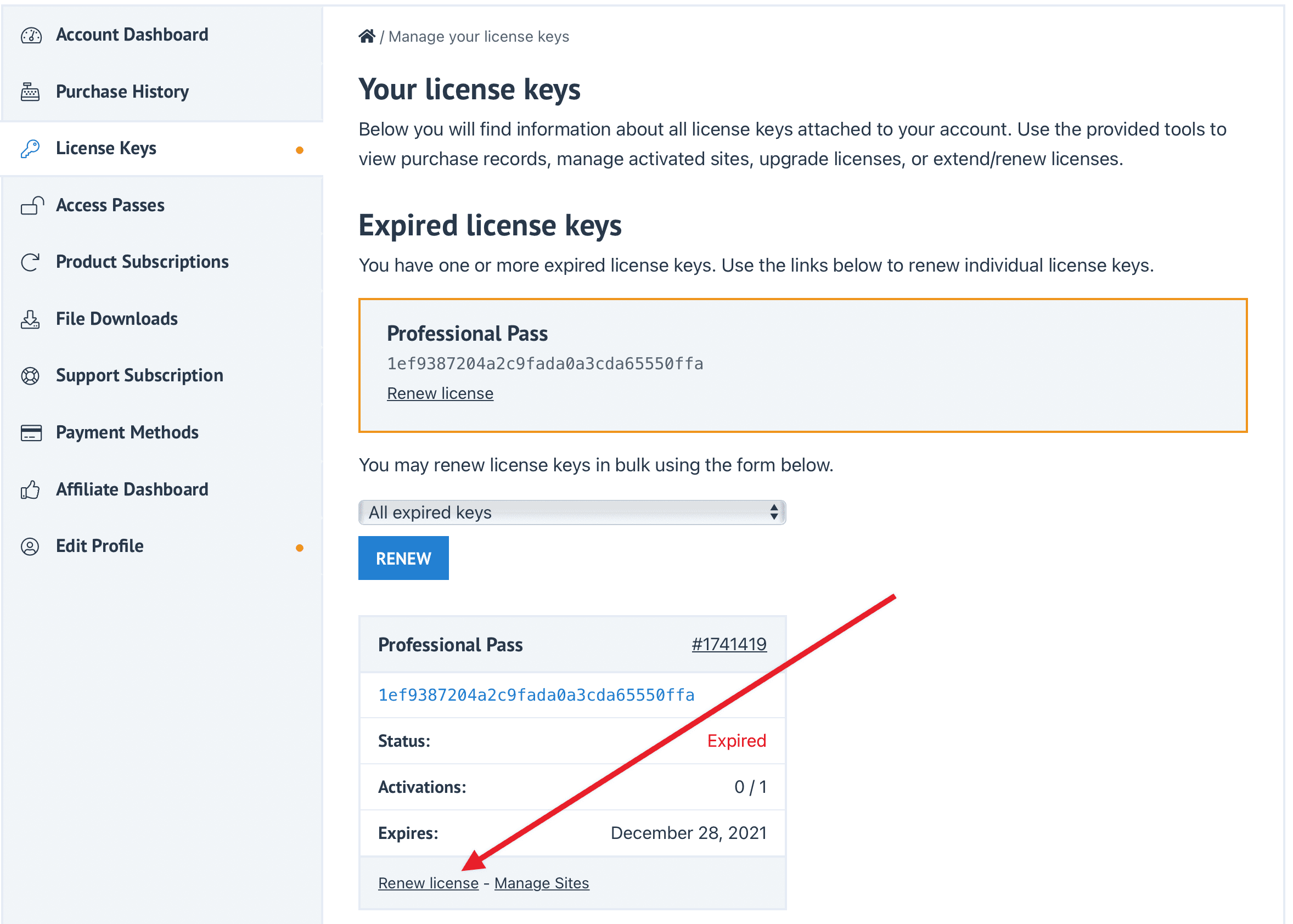 Your first notice that your license is going to expire should come in your email, sent to the address you used when you purchased the license. Your email reminder that your license will expire contains a link to the Easy Digital Downloads checkout page with cart contents and license key information pre-filled for a renewal, so that you can simply check out.