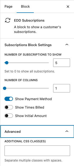 The new EDD Subscriptions block allows you to create a modern subscription management area, with the flexibility to be customized with options and custom CSS.